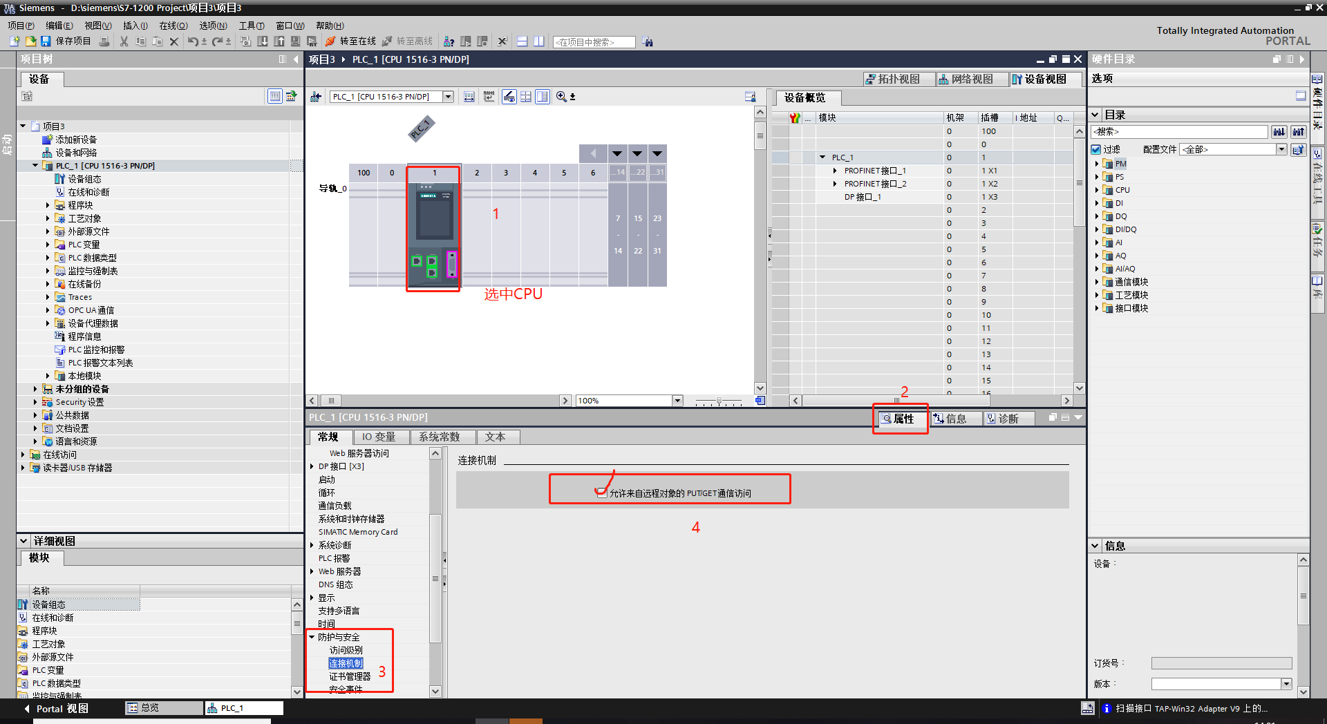 1.进入博图,“常规-保护”,连接机制勾选“允许从远程伙伴使用PUT/GET通信访问”,重启PLC。